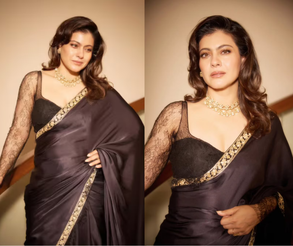 काजोल ने ब्लैक साड़ी को सिंपल लेकिन शाही अंदाज़ में कैरी किया। साड़ी का फ्लोई फैब्रिक और हल्का गोल्ड बॉर्डर इसे रॉयल टच दे रहा था। ब्लैक लेस ब्लाउज की फुल स्लीव्स ने पूरे लुक में मॉडर्न फील जोड़ा। यह लुक ट्रेडिशनल और कंटेम्पररी फैशन का परफेक्ट मिक्स था, जिसमें न तो ओवरड्रेसिंग थी और न कोई कमी।