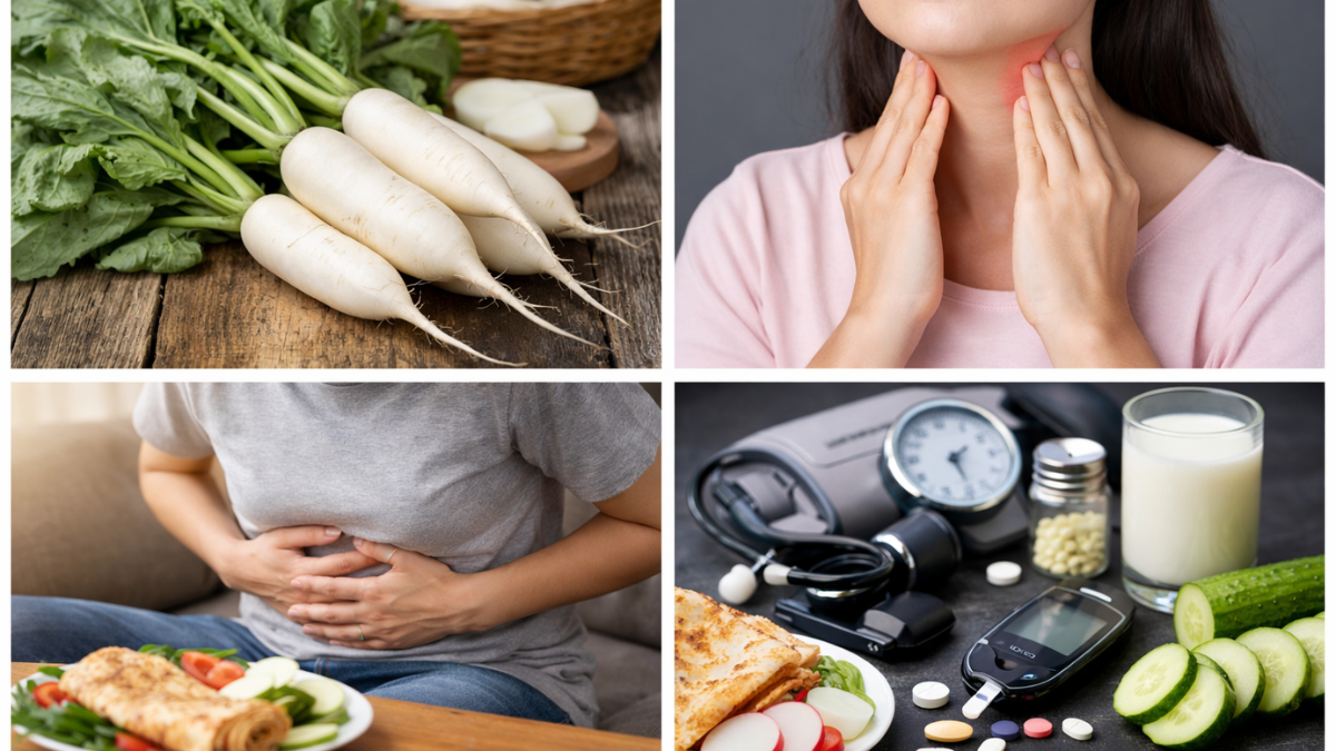 मूली में गॉइट्रोजेनिक तत्व होते हैं, जो थायराइड की समस्या बढ़ा सकते हैं।